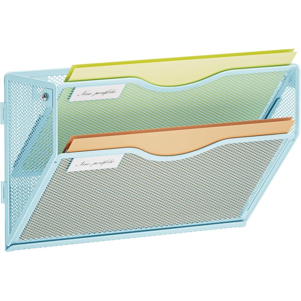 Marbrasse Wall File Holder 2-Tier Hanging Wall File Organizer, Mesh Mail Holder for Papers, Wall Mount File Clipboard & Magazine Organizer Great for Office Home (White)(2 tier – Blue)