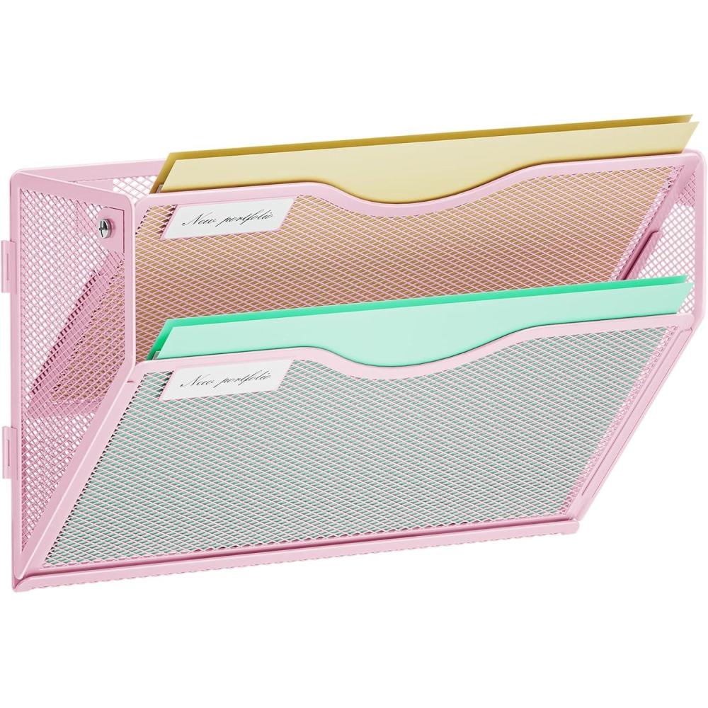 Marbrasse Wall File Holder 2-Tier Hanging Wall File Organizer, Mesh Mail Holder for Papers, Wall Mount File Clipboard & Magazine Organizer Great for Office Home (White)(2 tier – Pink)